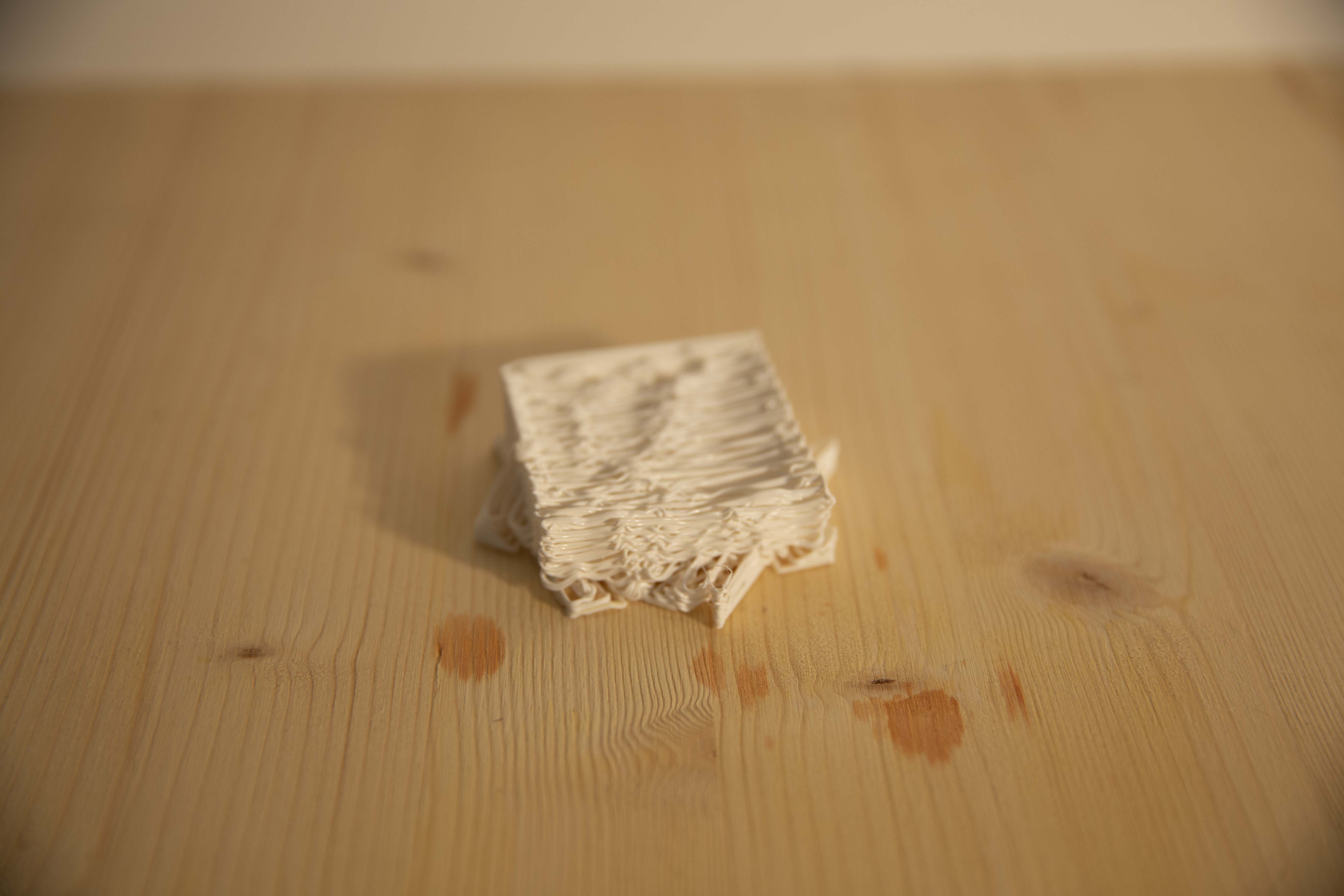 The next step was to shift the generated shapes from vase like shells towards a more filling thing. An obvious first experiment was to test a wave filling. Moving the toolpath from left to right while moving forward. It actually worked quite well, but is somehow limited to a rectangular shape. More complex geometrical forms would need some more consideration and algorithmic experimentation. However, filling and rotating layers worked as intended and created dense blocks of filament.