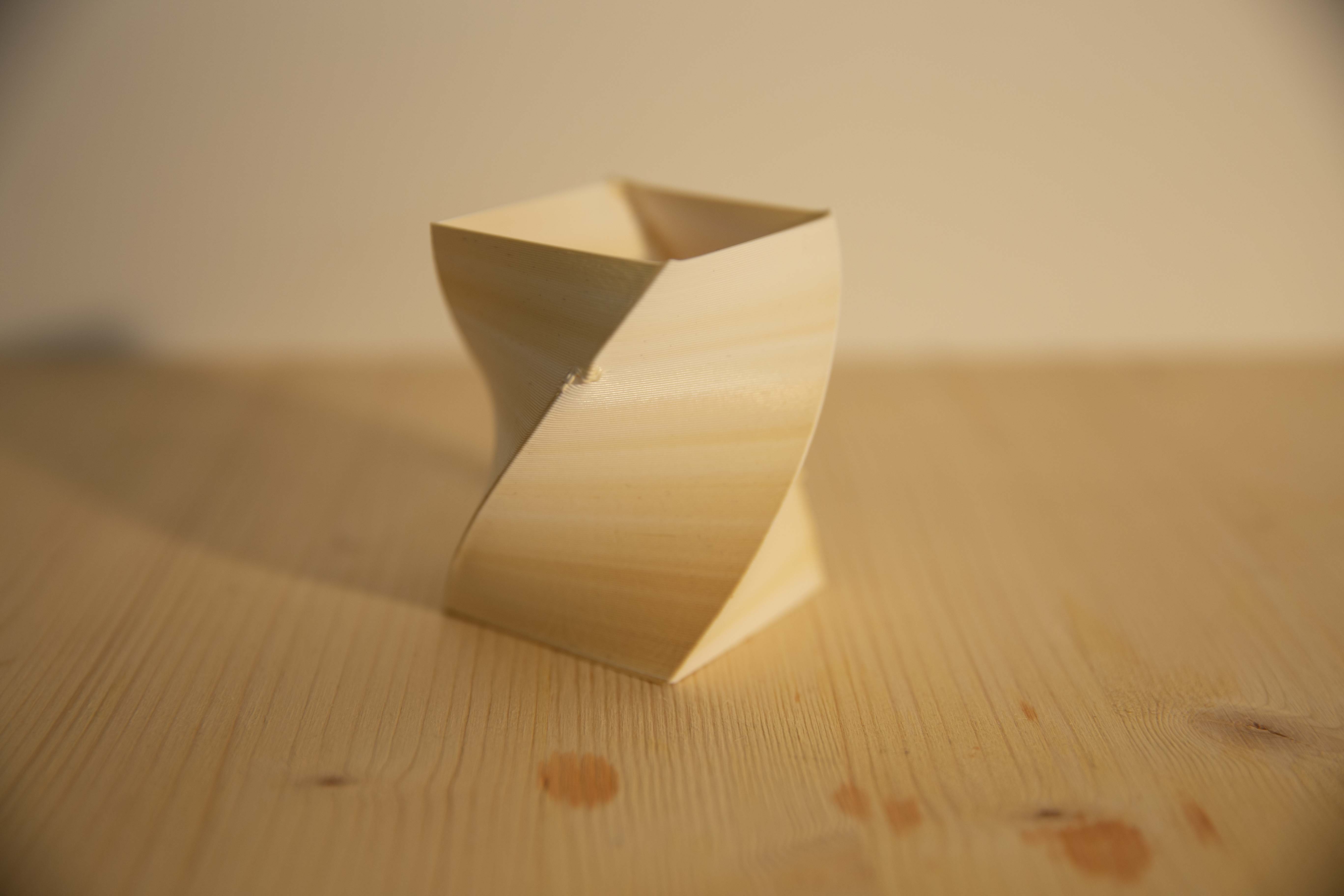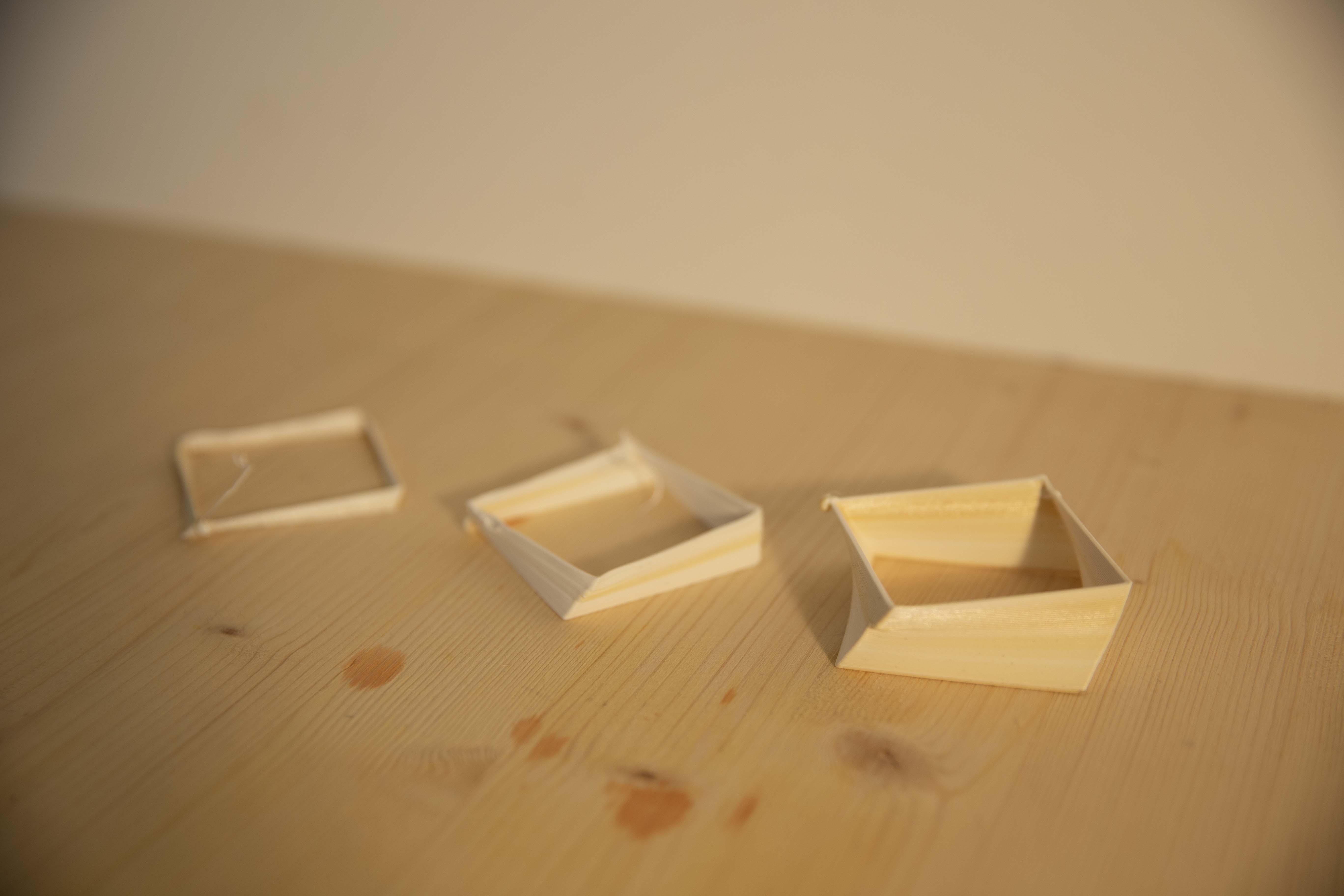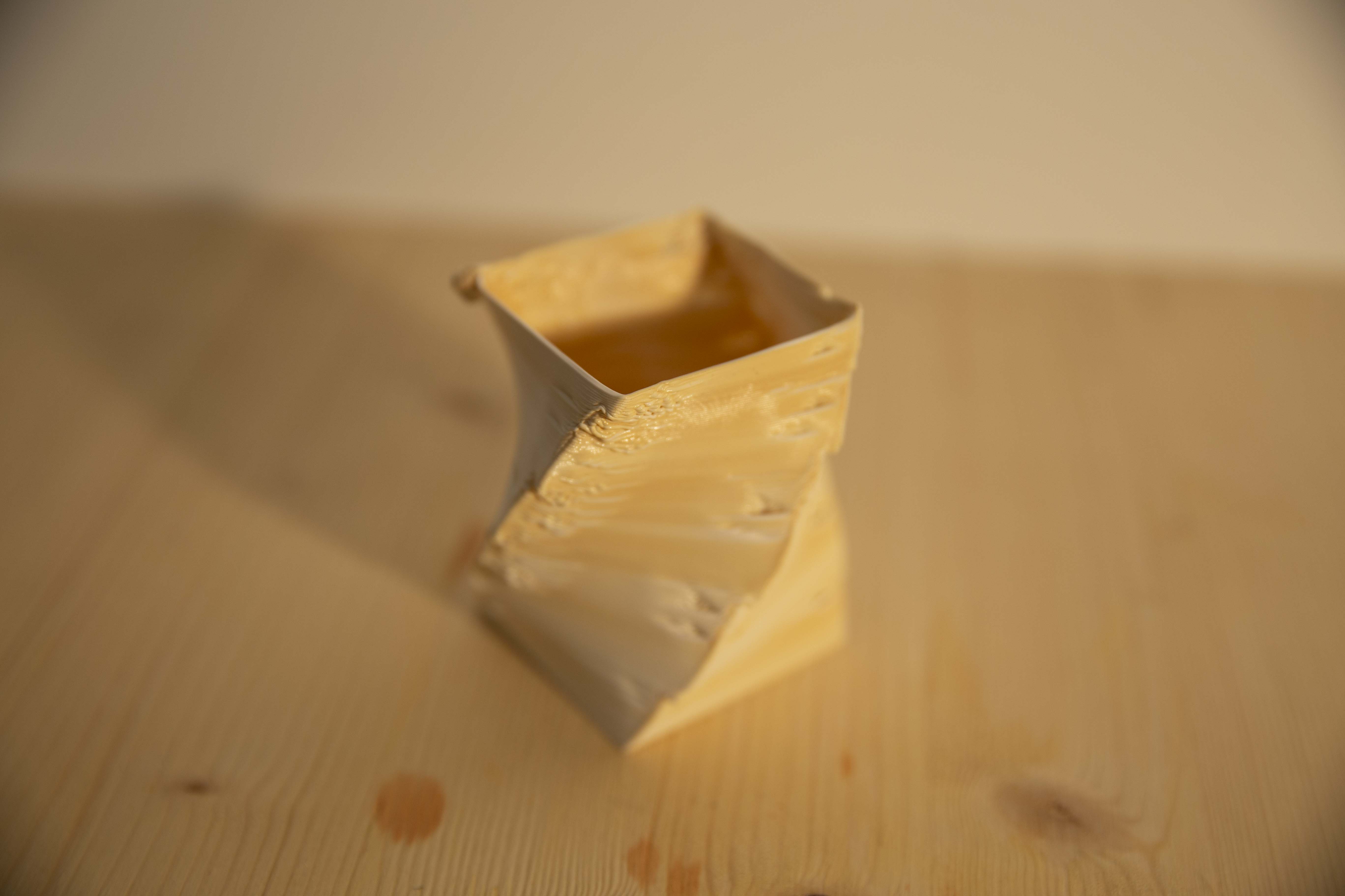 After getting the printer to work as intended the first experiments were all-around testing the capacities of the setup. What is possible as well as finding the right settings. Mainly a mix out of extrusion and flow rate combined with the layer height. The result was simple shapes, generated during runtime. A good extrusion rate seam to be at around 8 percent of the distance made. A flow rate of 1500 looks to be a solid speed. The layer height does not matter that much. At around 0.5 it works quite well at the moment.