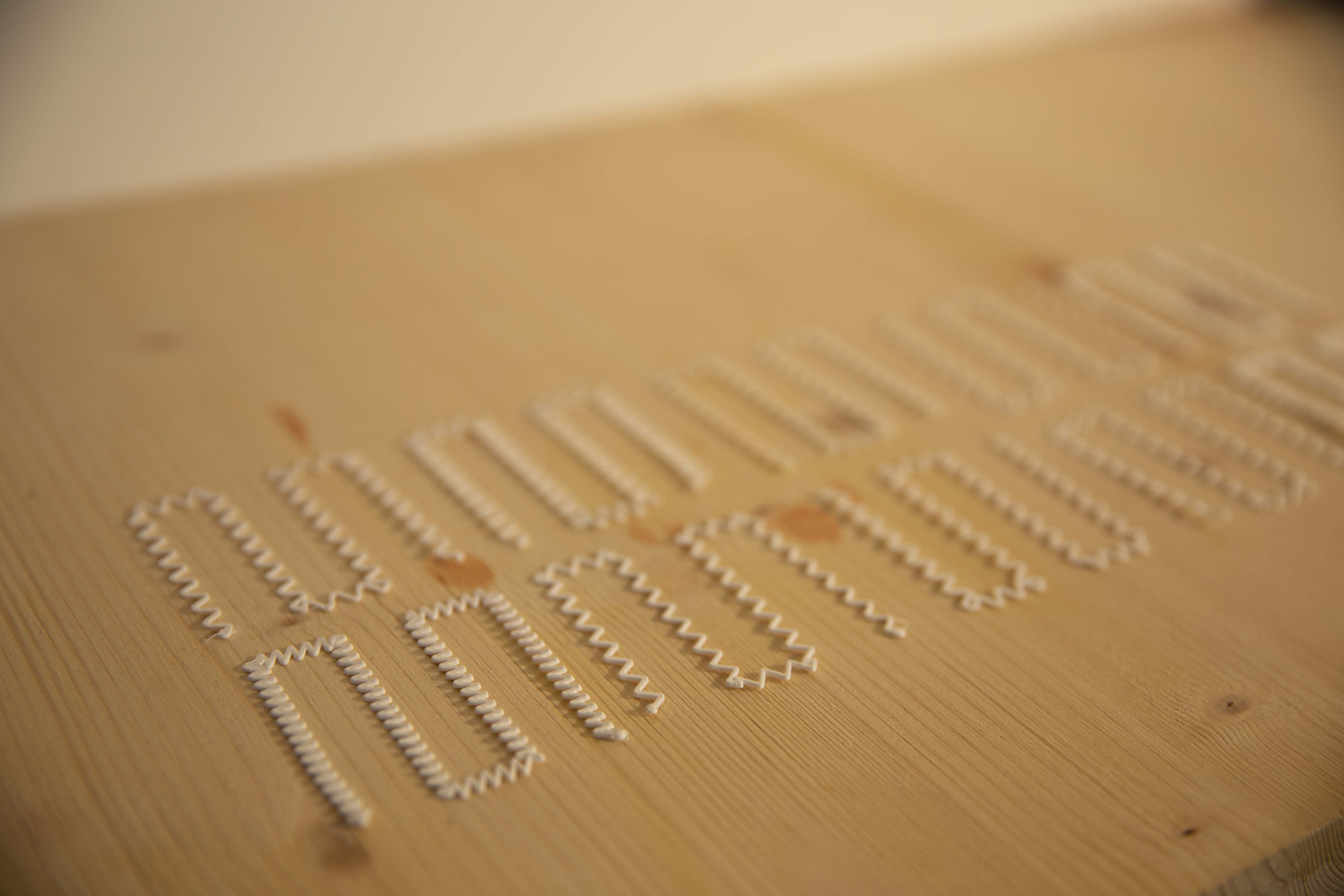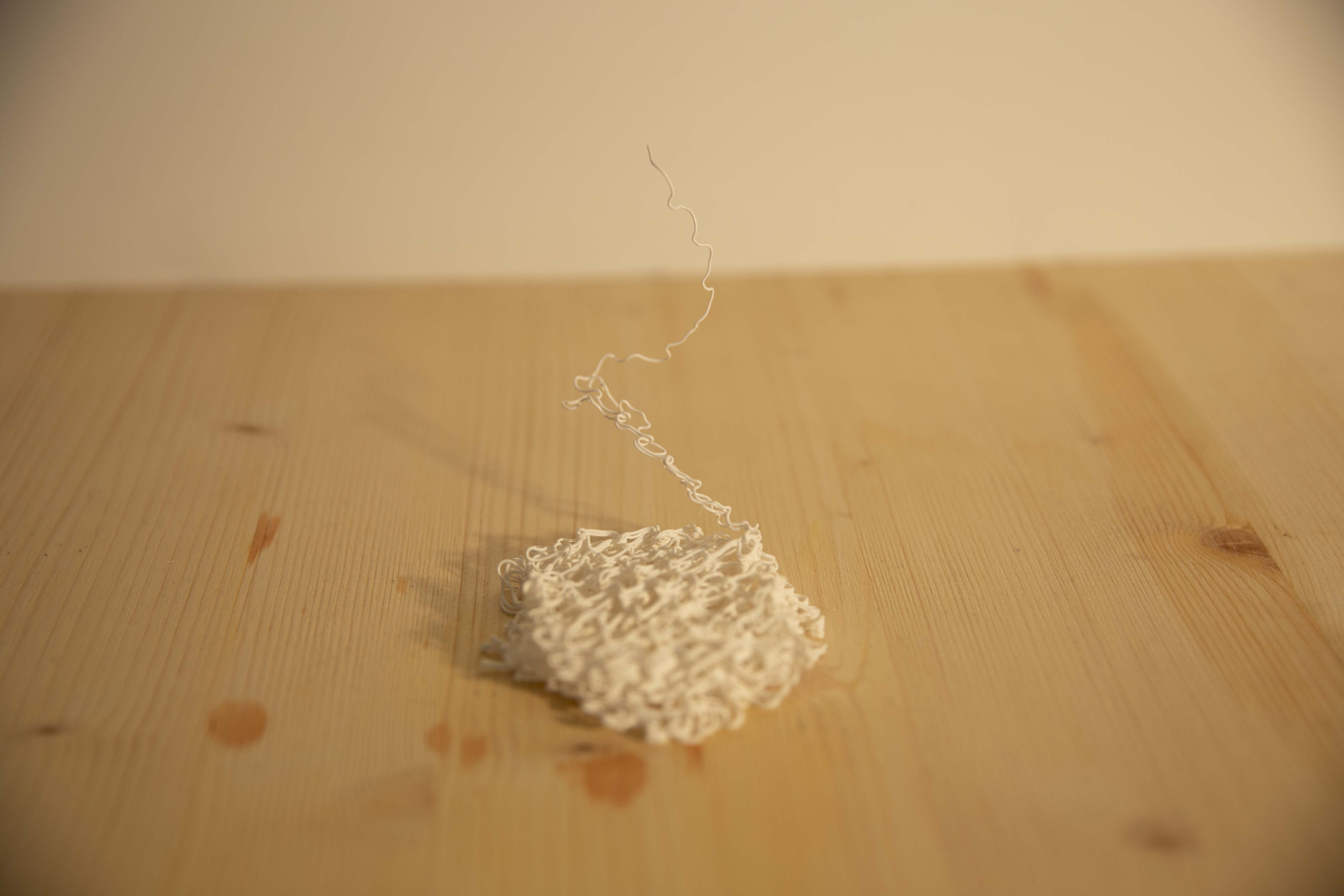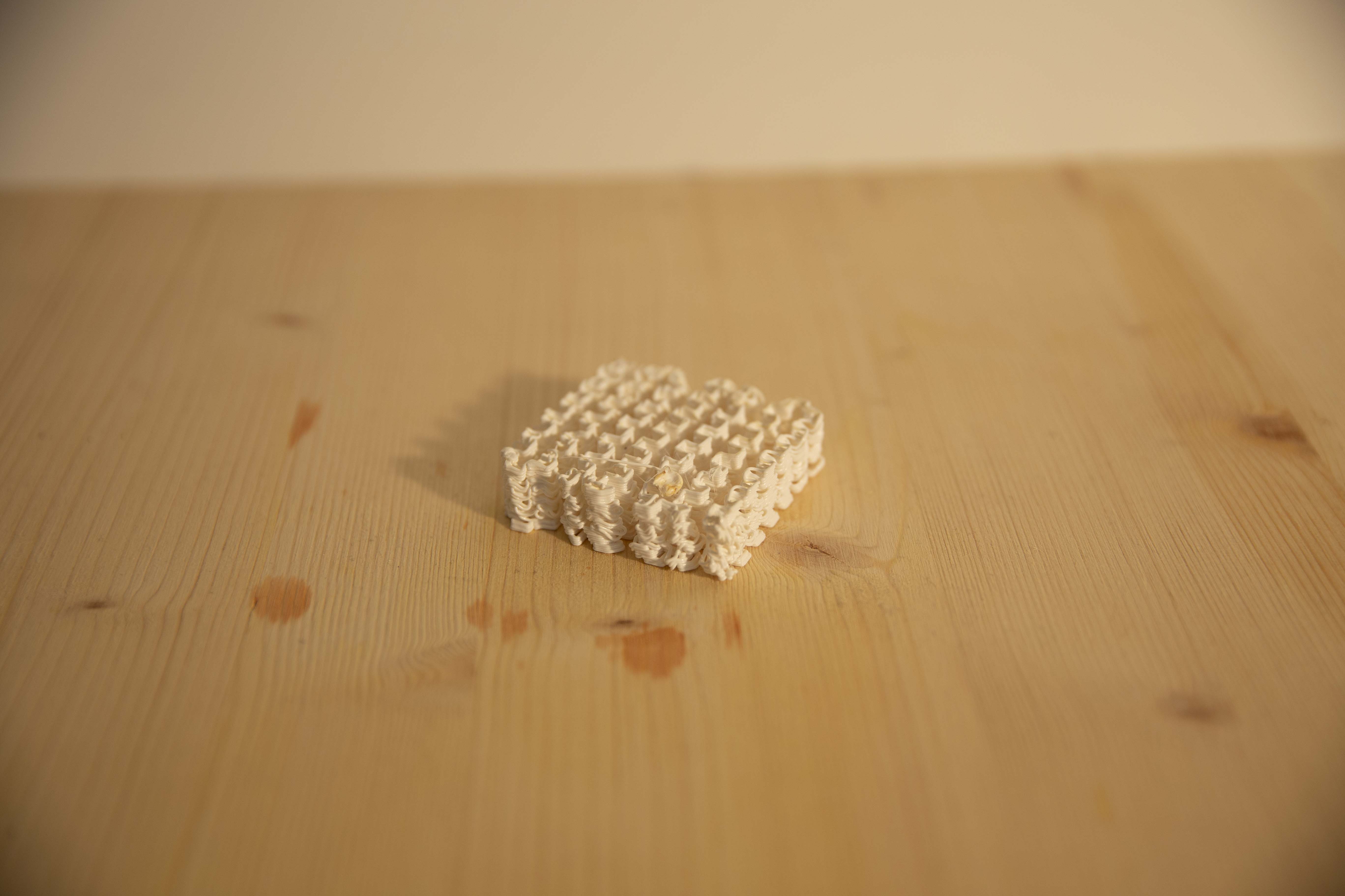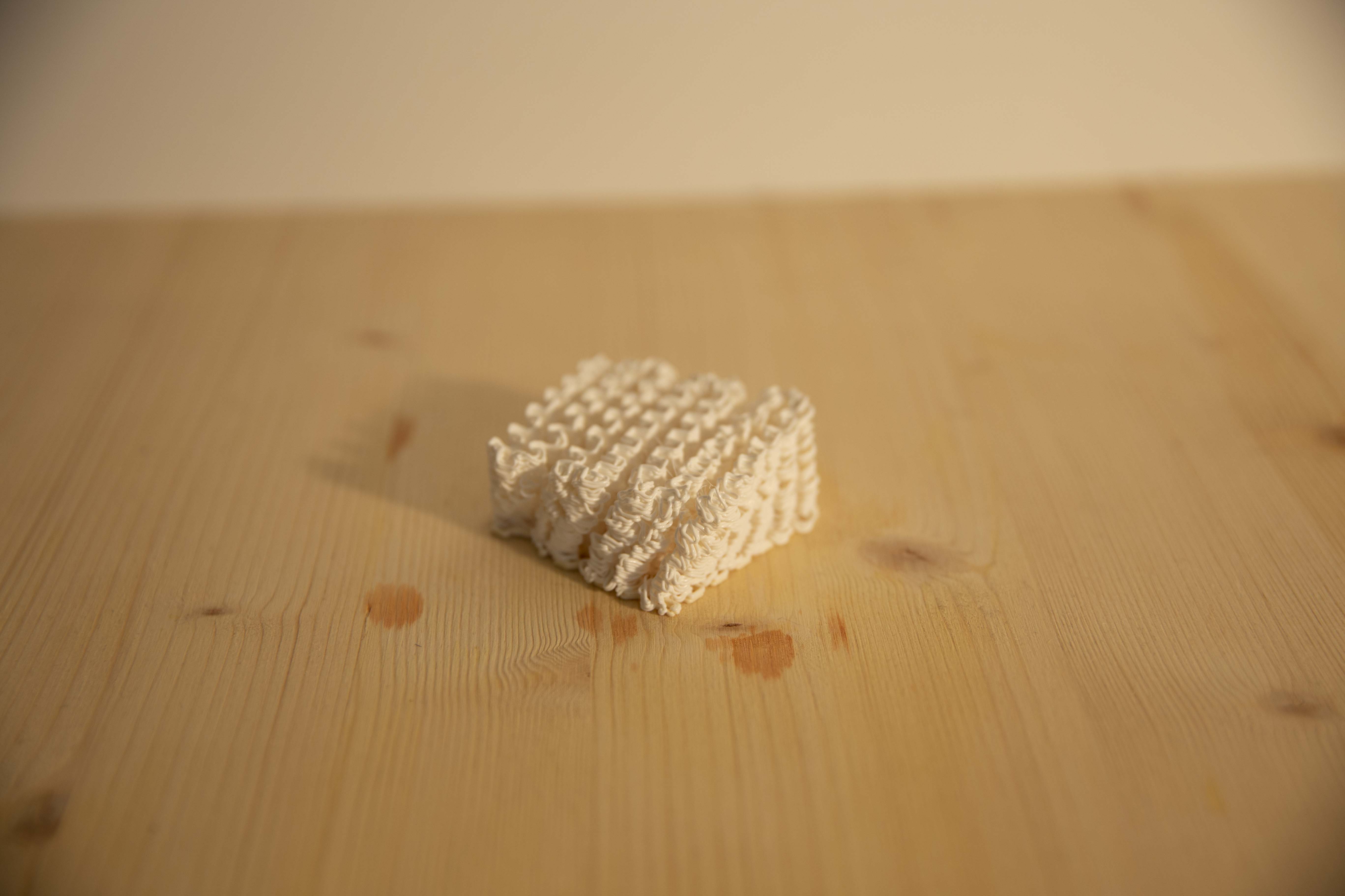 One of the important features is to create individual toolpaths. How does the line look like in the actual print? I implemented sine and triangle waveforms. Which I consider being the same with different settings. Square and saw waves. There is as well a last kind of wave which I called experimentally. It was in fact an attempt to create the saw shape with the help of Fourier transformations. It failed but is still an interesting addition to the collection. Some kind of dotted or interrupted lines would be nice as well but much more problematic to implement regarding the outflow of the filament. Slicer and shaper are working together smoothly at the moment and are as modular as they were intended to be. Multiple layers of wavy lines created noodle-like blobs. The outcome is still very hard to predict.